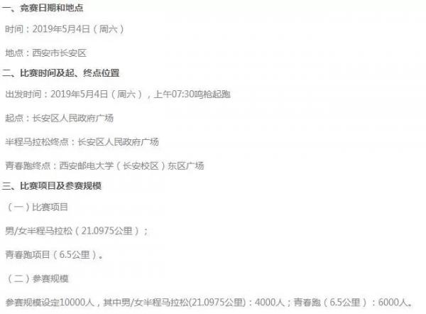 2019长安大学城半程马拉松将于5月4日(周六)举行,项目21.0975公里,青春跑6.5公里,半程马拉松参与人数4000人,青春跑6000人。