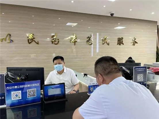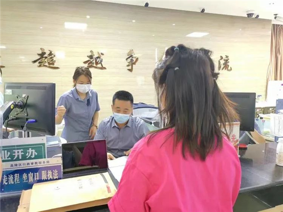 区行政审批服务局局长高立化身窗口工作人员,为前来办理公司注册变更业务的企业答疑解惑,协助企业进行线上申办、提交资料。