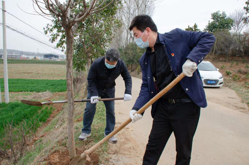 当前正处于疫情防控的关键期,但丝毫不影响大家义务植树的热情,一下车便拿起铁锹,快步走向植树点,挥锹铲土、堆起围堰、提桶浇灌,熟练认真地完成着每一道工序,连续种下35株樱花树。经过一番辛勤忙碌,一株株新绿昂然挺立,在和煦的春风中焕发出勃勃生机。