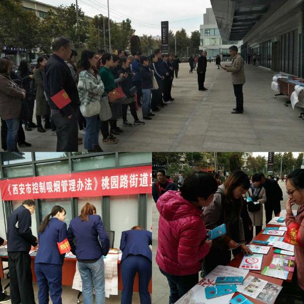 10月30日上午,桃园路街道办事处联合区审批局在莲湖区市民中心广场举办桃园路街道贯彻落实《西安市控制吸烟管理办法》大型宣传活动。启动仪式上街道武装部部长陈猛同志做重要讲话。街道办各科室干部、驻地各单位和社区的爱卫专干及过往群众约300余人参加。活动共发放《西安市控制吸烟管理办法》宣传折页500余份,“控烟健康教育核心信息”和“慢病防控健康行动”等宣传彩页800余份。同时莲湖区市民中心利用大型电子屏幕醒目显示:“《西安市控制吸烟管理办法》于2018年11月1日起施行,室内公共场所、工作场所和公共交通工具全面禁烟。《办法》规定:在禁止吸烟的场所吸烟的个人,罚款10元;场所控烟不力,罚款500-1000元。控烟投拆举报电话:12345”,吸引许多过往办事群众驻足观看、认真阅读。