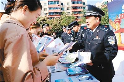 民警在大明宫万达广场开展扫黑除恶专项斗争集中宣传活动。