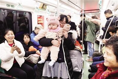 妈妈抱着六个月大宝宝也来体验地铁四号线