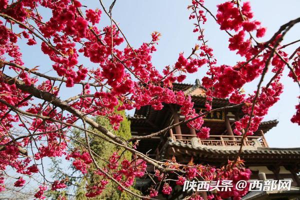 红色的彼岸樱。青龙寺樱花季的时间在一个月左右,樱花季里,早期的彼岸樱、八枝垂樱、野生樱、染井吉野,中期的一叶、杨贵妃、郁金、关山、松月,晚期的红白普贤像等十几个品种的樱花将依次开放,不同时段能欣赏到不同的樱花。