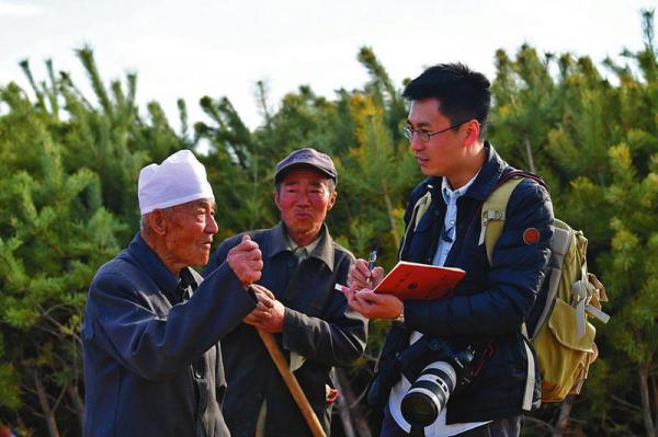 4月12日,本报记者张辰(右一)采访靖边县“治沙英雄”郭成旺父子。记者 雷魏添摄
