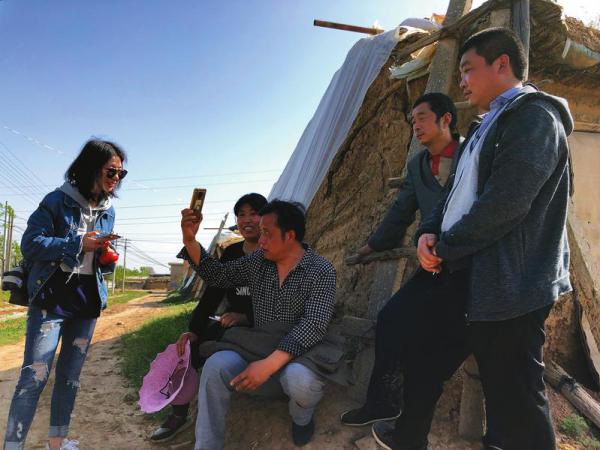 4月16日,蹲点记者在咸阳市泾阳县云阳镇参观采访种植户高竹玲的普罗旺斯西红柿大棚后,听取云阳镇电商办主任张广俊(右三)介绍网店运营及当天的订单情况。 记者 刘印摄