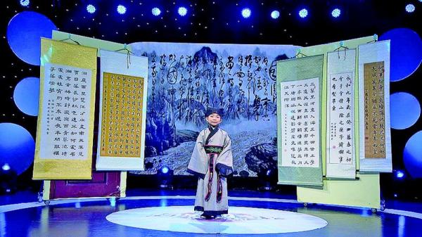 节目现场,张晓博首先带来了古诗词朗诵《临江仙·滚滚长江东逝水》,随后他与主持人聊书法,教其写毛笔字,畅谈“柳书”文化,最后还用草书赠予节目组“超级萌宝秀”五字。录制的各环节,现场都掌声不断,对来自柳公权故里——陕西铜川的这一书法“小神童”张晓博,现场嘉宾及专家个个惊叹,人人竖起大拇指,为其精湛的书法表演点赞鼓励!