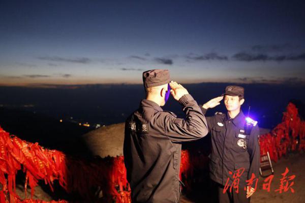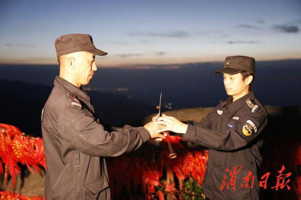 韩宇气喘吁吁地来到西峰,在确保西峰主峰区没有游客滞留的情况下,在西峰和南峰交汇处的平台上,他和南峰区域的安保孟世雄完成了夜间值班任务交接,又踏着夜色向东峰观日台走去。
