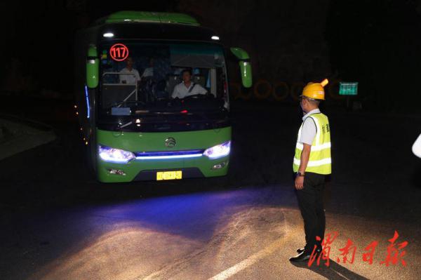 8月14日晚9时30分,在西线客运专线公路10公里弯道处,田新旭和一名同志正在挥动红色警示棒指挥下行车辆安全通过。他说,为了保证暑期、节假日和重点时段等旅游高峰车辆行驶安全,他们都会在专线公路3个弯道处安排专人进行定点巡查指挥。在恶劣天气情况下还要检测山体是否有塌方、河道是否涨水等情况,如果发现异常特殊情况,在第一时间及时进行汇报,防止意外事故的发生,确保运营车辆安全通行。