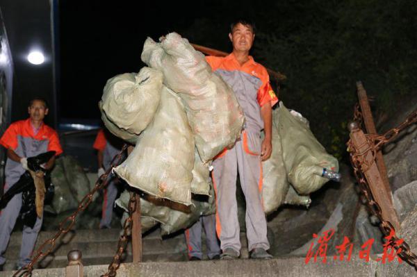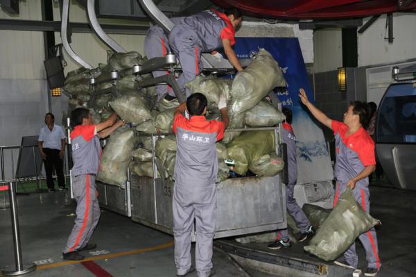 晚上10时40分,华山之上,夜色斑斓。北峰索道上站没有了白日的热闹和喧嚣,周围一片寂静,只见几名环卫工人正将垃圾收集平台的垃圾挑到索道上站旁边的房子里,这里的垃圾袋堆积如山,他们每人得挑好几个来回。