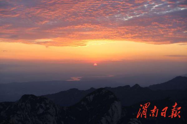 凌晨5时,东峰观日台已挤满了4000多名游客,他们在等待日出东方的辉煌时刻。东方开始出现鱼肚白,黄河之水隐隐向东流,一片阴云如大幕般挂在眼前,慢慢地泛着红光,越来越亮,越来越艳。大约5时40分,一个红点在慢慢升腾,不一会儿化作一个巨大的火球冉冉升起。顿时,红霞满天,日出东方,这就是人们期待已久的华山日出。