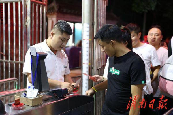 晚11时许,记者现场看到身份证 “4100”打头的3名游客,通过王钊手持的检票机刷身份证顺利入园,感到很方便也很新奇。