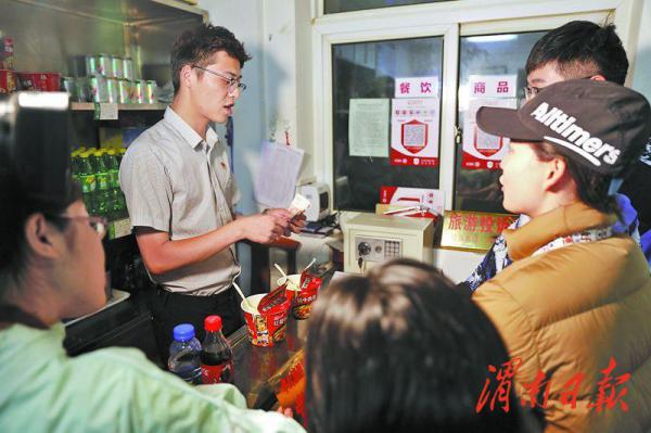每当夜晚来临,这里就是步行登山游客的聚集区,特别是在旅游旺季,每天夜间接待游客数量都在4000人次以上,工作量很大。王钊和同伴们在工作岗位上一站就是四五个小时。