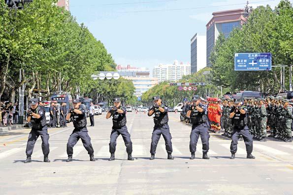 8月16日,铜川市公安局在新区举行铜川公安“践行新使命、忠诚保大庆”反恐安保实战演练誓师动员大会。7个现场演练方队分别进行了车辆查缉战术、处置个人极端暴力事件、警务技战术动作汇演、防暴棍术、反劫持人质、武警擒拿格斗、灭火救援等科目演练,反恐实战演练科目通过4G技术音视频实时传输主会场电子大屏。演练内容丰富、贴近实战,动作规范、战法娴熟,全面展示了全警实战练兵成果,检验了铜川公安多警种、多部门指挥调度、快速反应、协同作战、现场处置、战法对策等综合能力和实战水平。