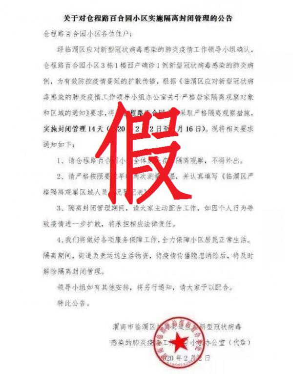 2月2日22时30分左右,一条《关于对仓程路百合园小区实施隔离封闭管理公告》在我市众多网友微信群、朋友圈陆续转发,引起群众恐慌。