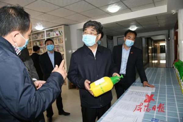 3月25日,市委书记岳亮深入城区检查学校开学准备和疫情防控工作时,在咸阳中学察看师生分流通道,了解住宿和日常管理等情况。