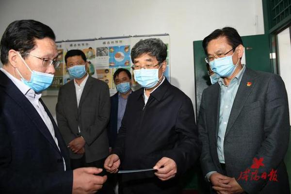 岳亮首先来到实验中学,察看入校检测情况,检查隔离室、防控物资储备、洗手设施和师生食堂等,强调要红外线与电子测温枪并重做好体温测量,落实防疫消毒措施,加强教室、食堂、宿舍等通风,在疫情防控上争做全市表率。