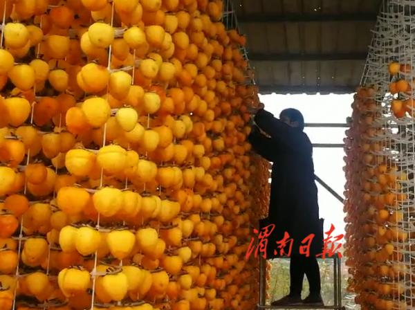 立冬前后,虽已进入农闲时节,临渭区故市镇板南村上的一处柿饼加工点里,却是一派红红火火的农忙景象。霜降之后,这里已经挂果的几十亩尖柿被陆续采摘下来,或者存入冷库,或者清洗削皮,或者挂架晾晒……一道道复杂的工序之后,它们将蜕变为香甜软糯的柿饼,并走进千家万户。