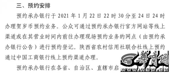 其中提到,预约承办银行于2021 年1 月22 日22 时30 分至24 日24 时 办理贺岁币预约业务。公众可通过预约承办银行官方网站等线上 渠道或在其营业时间内前往办理现场预约业务的网点(由预约承 办银行公告)进行预约登记。