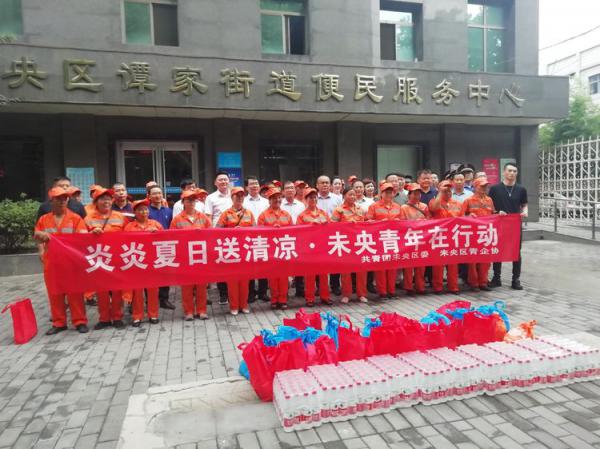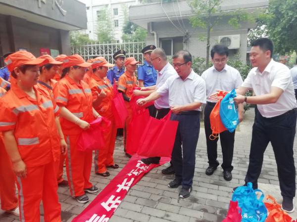 8月8日下午,共青团未央区委,未央区青年企业家协会,慰问谭家街道保洁员及执法队员,未央区副区长程希文在谭家街道党工委书记陈斌的陪同下,为辖区奋战在一线的保洁员送来了毛巾、矿泉水、冰糖等防暑降温品。程希文副区长对保洁员及执法队员能在高温酷暑下认真的做好保洁及城市管理工作的精神给予了肯定。代表区政府对保洁员及执法人员进行了慰问。叮嘱他们在工作中注意身体,做好防暑降温工作, 确保广大保洁员度过一个安全、健康、清凉的夏季。
