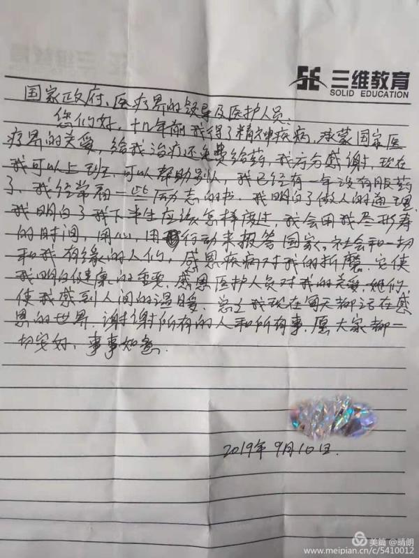 就在前不久,中心还收到了另外一位患者的感谢信,这位病患描述的是自己患病十余年来,在党和政府亲切关怀下,在社区服务中心的悉心指导之下,疾病得到有效控治并成功回归社会,字里行间洋溢着满满的感激之情。