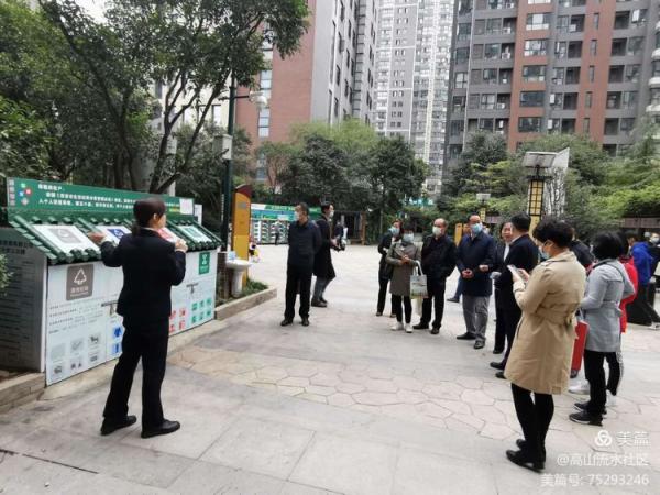 高山流水社区工作人员带领调研学习人员对辖区内的社区文化环境、垃圾分类、智能废旧回收终端“小黄狗”、便民服务大厅进行了参观讲解。