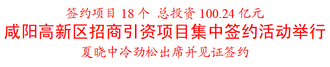7月19日下午,咸阳高新区招商引资项目集中签约活动举行。市委书记夏晓中、市长冷劲松出席并见证签约。市委常委、常务副市长韩宏琪主持签约活动。市委常委、市委秘书长、市委统战部部长王春霄参加。