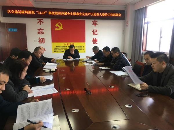 11月21日区交通运输局在三楼会议室,召开汲取“11.13”事故教训深入开展今冬明春安全生产大排查大整治工作部署会,机关科室主任,基层单位领导,各运输企业,养护企业主要负责人参加会议,会议由副调研员孙升旺主持。