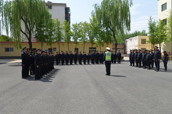 早上8:40,执法队员身着制服在阎良区城管局院内整队集合,按预定方案组合四个方队进行分训,训练内容有整理着装、整齐报数、敬礼礼毕、立正稍息、左转右转、行进与立定等科目。